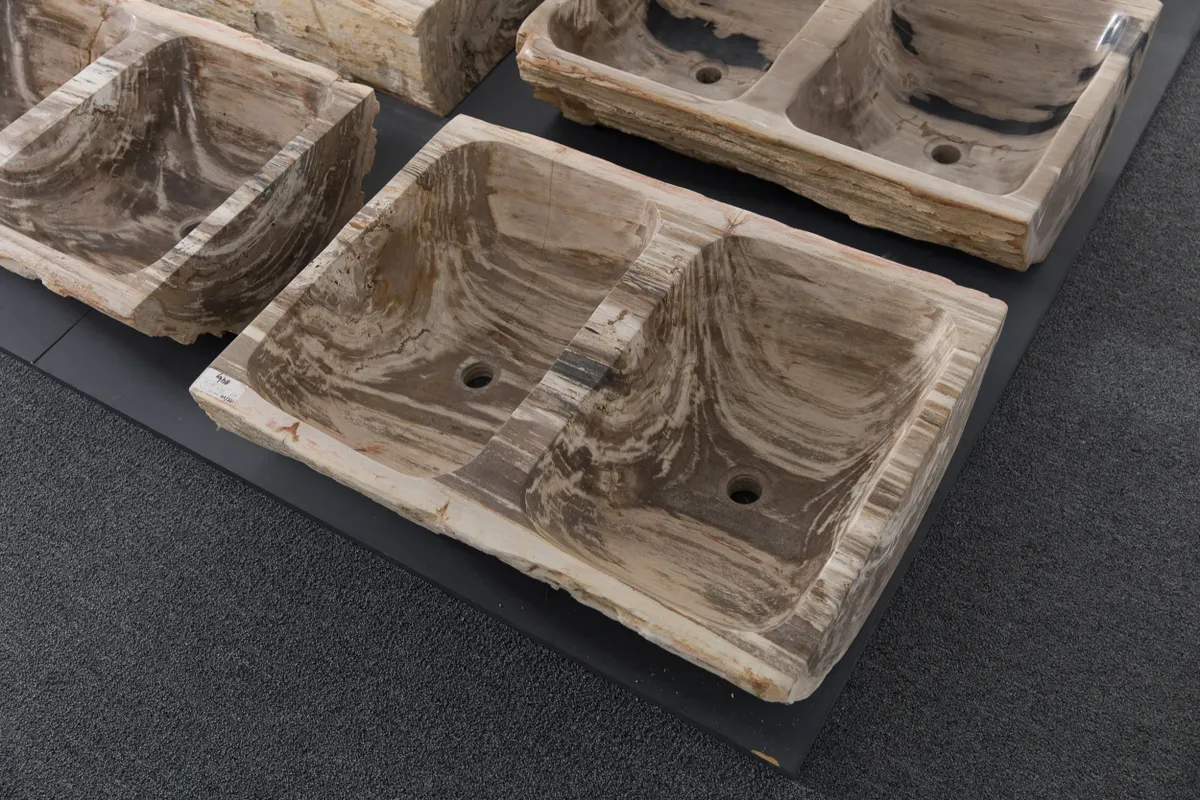 Fòssięl excavated, carved, and polished ancient petrified wood dating back to 20-25 million-year-old to create an unexampled and never offered before piece for the home to accommodate a rustic pallet. The glistening light wood and its smooth edges perfectly lodge a comfortable design for the kitchen.