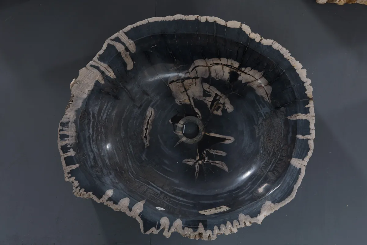 Fòssięl excavated, carved, and polished ancient petrified wood dating back to 20-25 million-year-old to create an unexampled and never offered before piece for the home to accommodate a rustic hue. The glistening dark wood and its raw edges perfectly lodge a comfortable design for the kitchen.